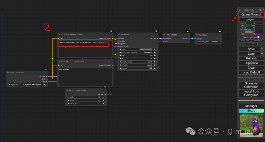 启动ComfyUI,点击“Queue Prompt”,直接就能生成图片。如果想自定义生成图片,直接在第二个红框处输入想生成图片的英文关键词,再点击“Queue Prompt”即可。