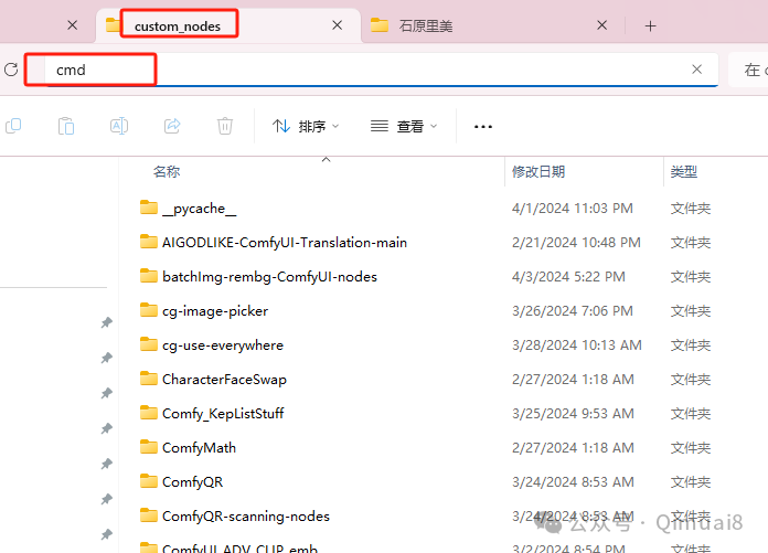首先要安装的节点(插件),就是ComfyUI- Manager。安装方法很简单,在你的ComfyUI安装文件夹里,找到一个叫“custome_nodes”的文件夹,打开之后在搜索栏输入“cmd”,回车打开一个黑乎乎的页面。