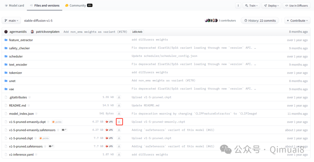 去这个网站下载SD 1.5基础模型,点击下图中的红框就可以下载。当然,在我们的网盘文件夹里也有这个文件。