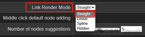 在“Link Render Mode”里面,点击选择“Straight”,就可以把ComfyUI里面的连线变直。
