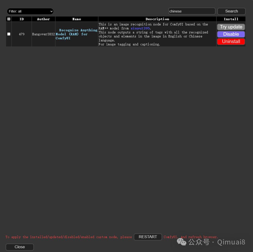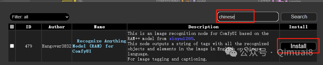 点进去之后,再点击“Install Custom Nodes”,稍等片刻,弹出另一个窗口,在搜索栏输入要安装的节点名称,点击“Search”找到要安装的节点,点击”Install“,下面会显示一行绿色的字,表示正在安装:Installing ‘Recognize Anything Model (RAM) for ComfyUI’。