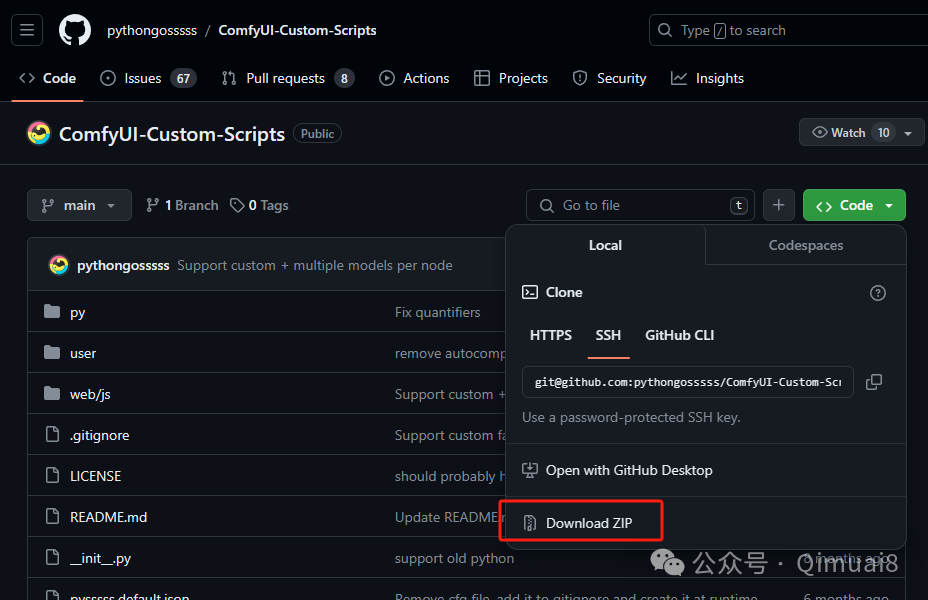 到GitHub上去下载安装包(如下图),然后解压到“custome_nodes”文件夹,重启ComfyUI就可以了。