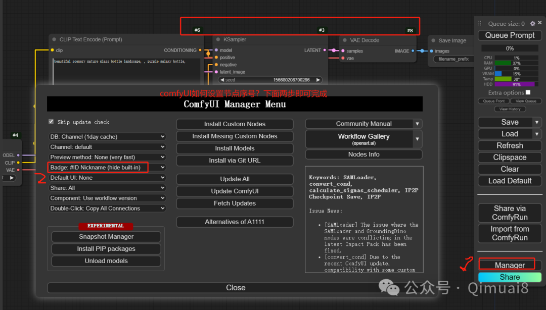 好,到目前我们已经学会了安装ComfyUI和安装ComfyUI运行所需的节点。接下来,我们来设置一下操作界面。