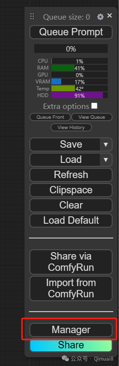 如果安装成功了,在ComfyUI的界面,最右端的菜单栏最下面,会有一个“Manage”的按钮,点它!(记住这个万能按钮,以后会经常用到)。