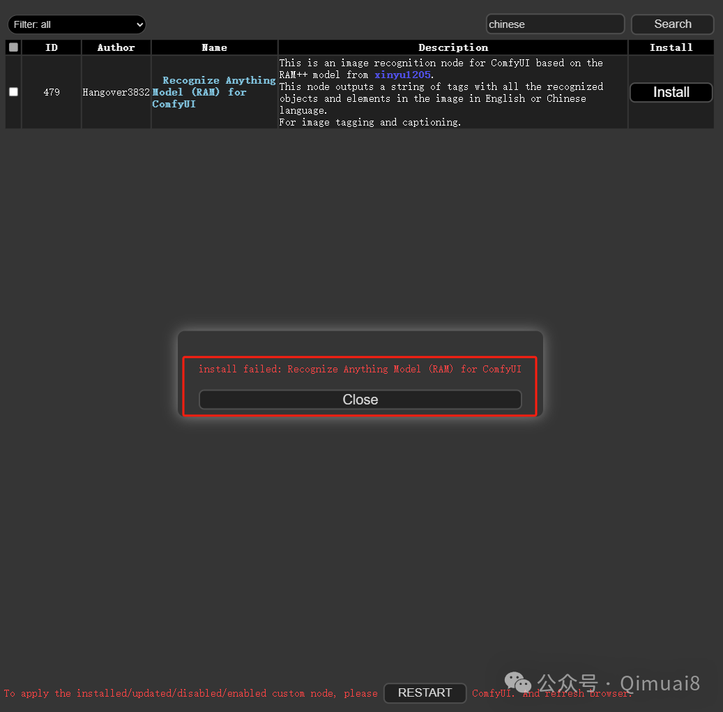 网络不行话,会显示下面的红色字体:”install failed: Recognize Anything Model (RAM) for ComfyUI”