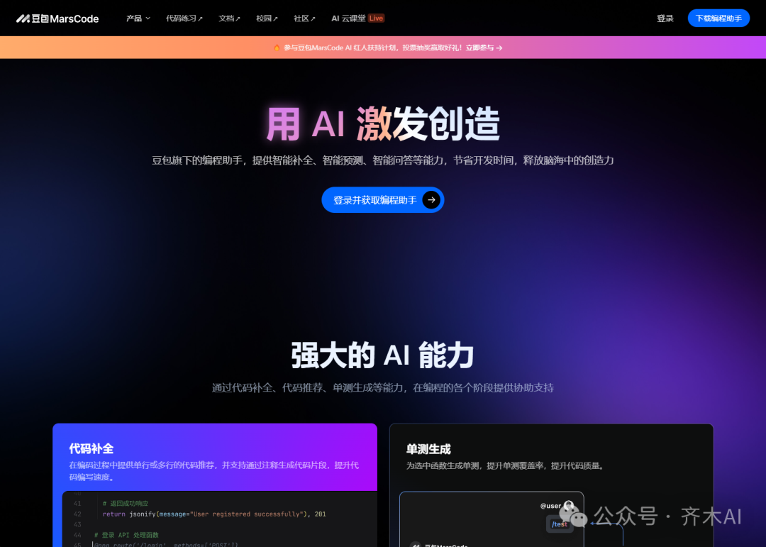 豆包MarsCode 提供智能代码补全功能,支持主流编程语言和IDE,能在开发过程中提供单行代码或整个函数的编写建议。