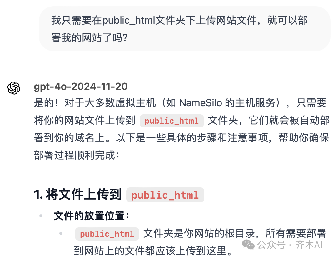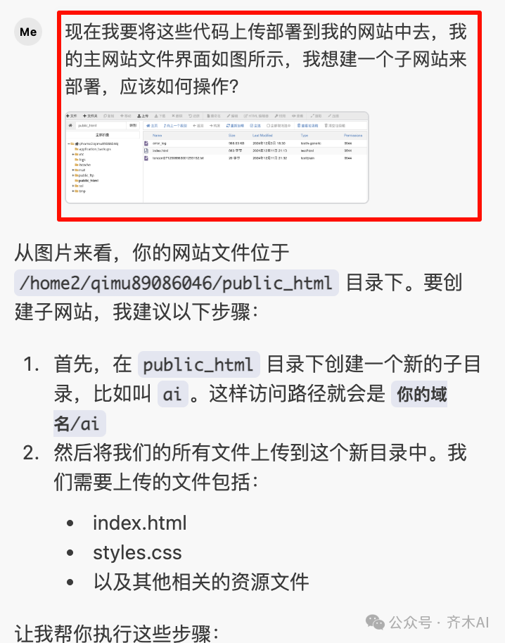 当你觉得做出的网页效果符合你预期之后,就可以上传到服务器部署了。方法还是问AI,下面是我的一系列提示词如下,可以参考: