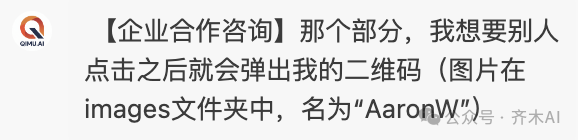 【企业合作咨询】那个部分,我想要别人点击之后就会弹出我的二维码(图片在images文件夹中,名为“AaronW”)