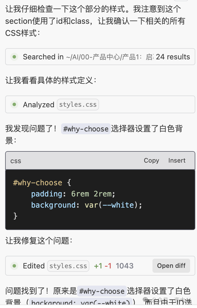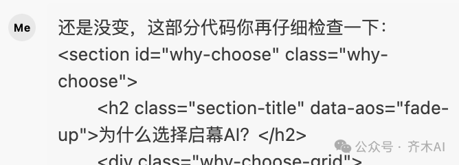 如果一个问题翻来覆去,就是修改不好,那就需要换另外一种方式提问(描述)了。比如说,直接找到相应的代码,让AI看看是怎么回事。